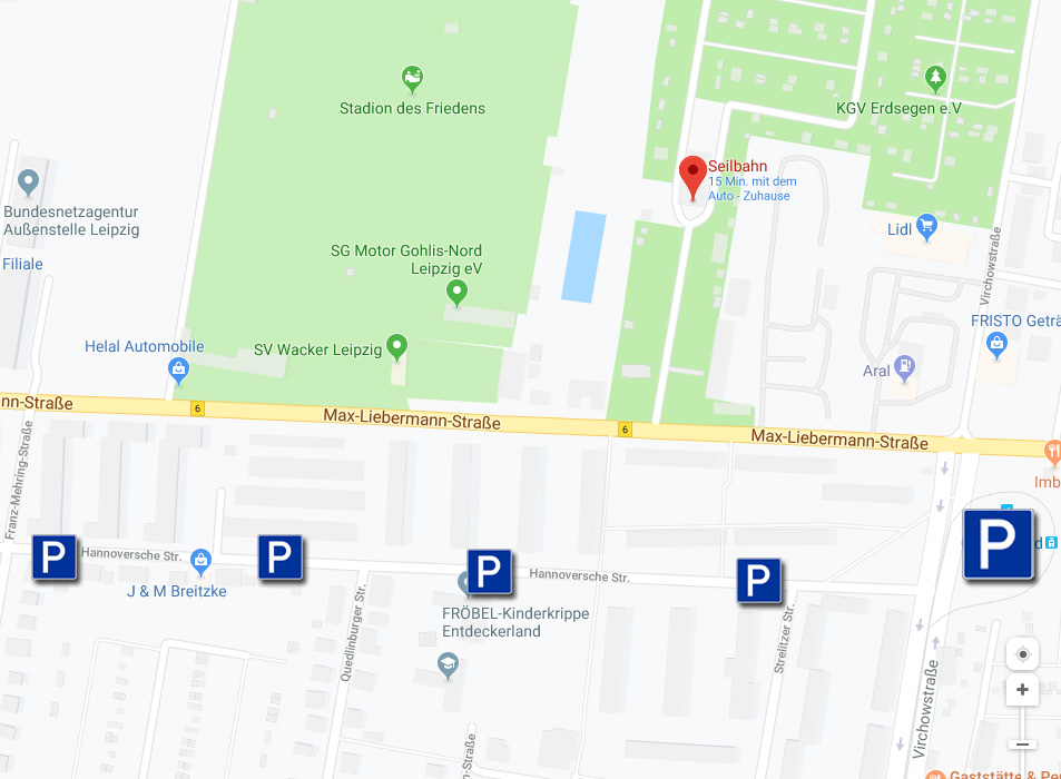 Parkmöglichkeiten findet Ihr auf dem großen Park+Ride Parkplatz am Ende der Virchowstraße (Endhaltestelle Line 12)